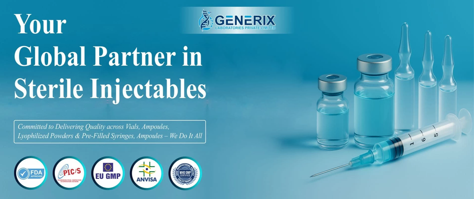 At Generix Laboratories Private Limited, our strength lies in our unwavering dedication to quality, innovation, and international healthcare access. With over two decades of experience in the pharmaceutical industry, we specialize in high-end formulations, global product registrations, and regulatory-compliant supply of essential medicines. Our operations are powered by WHO-GMP certified facilities, robust quality systems, and a dynamic team with deep domain expertise. Today, our presence extends to 50+ countries, where we continue to deliver reliable, affordable, and life-saving healthcare solutions across key therapeutic areas including injectable, inhalation therapies, biosimilar, and critical care products.